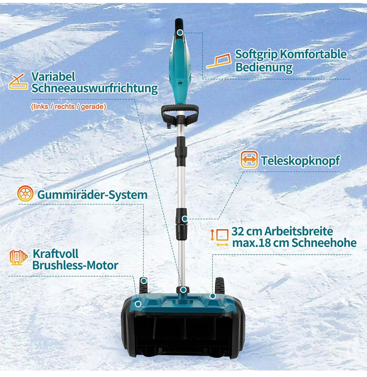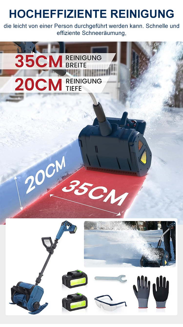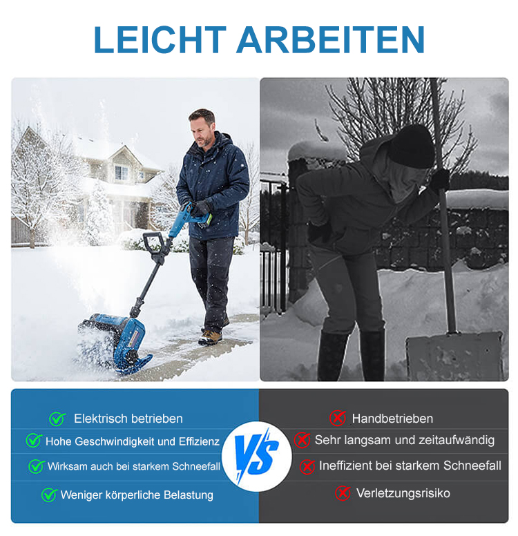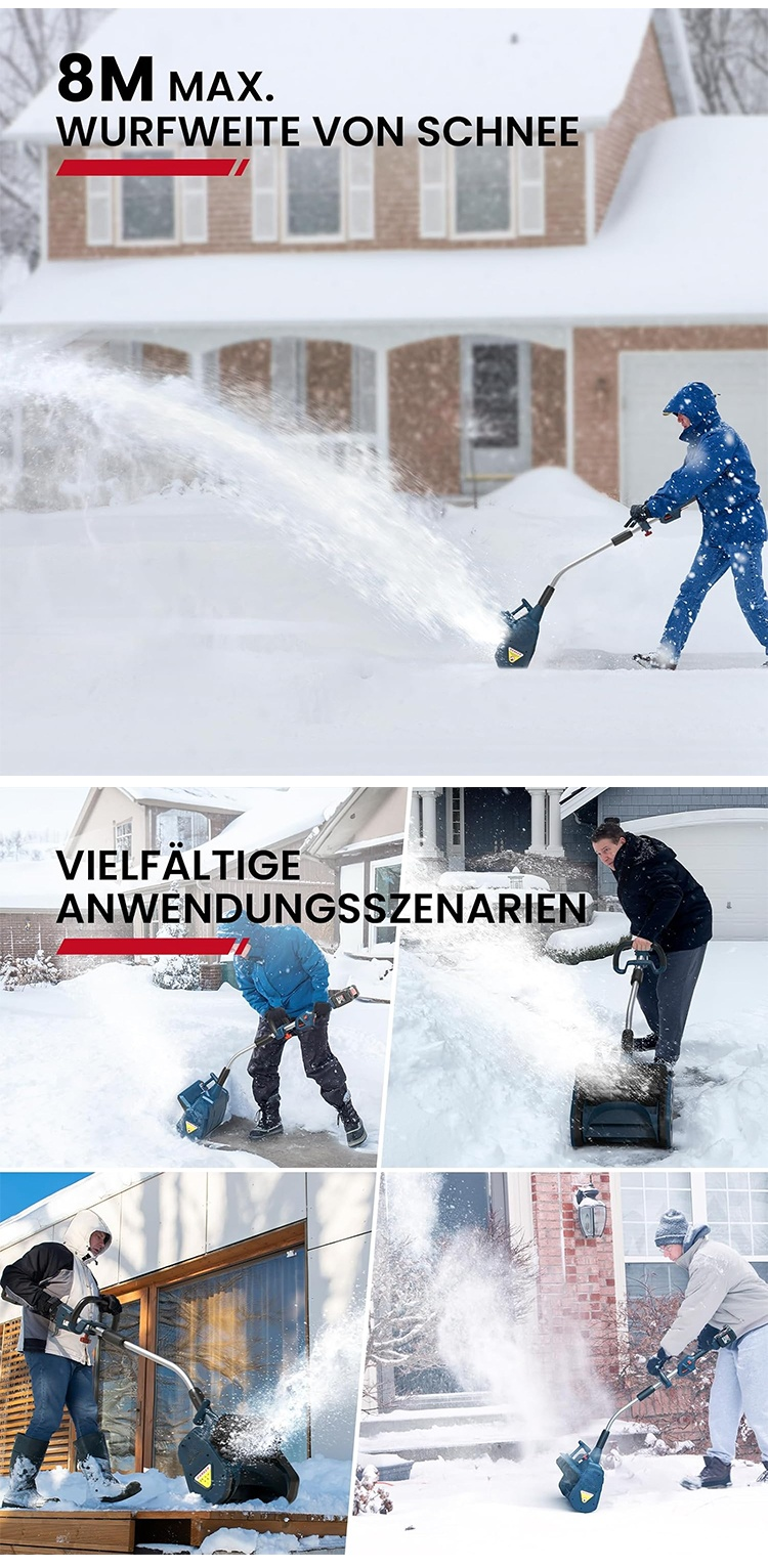 Verabschieden Sie sich von der Müdigkeit und dem Lärm herkömmlicher Schneeschaufeln. Dank ihres leichten Designs und des leistungsstarken Motors ist sie Ihr zuverlässiger Helfer im Winter!